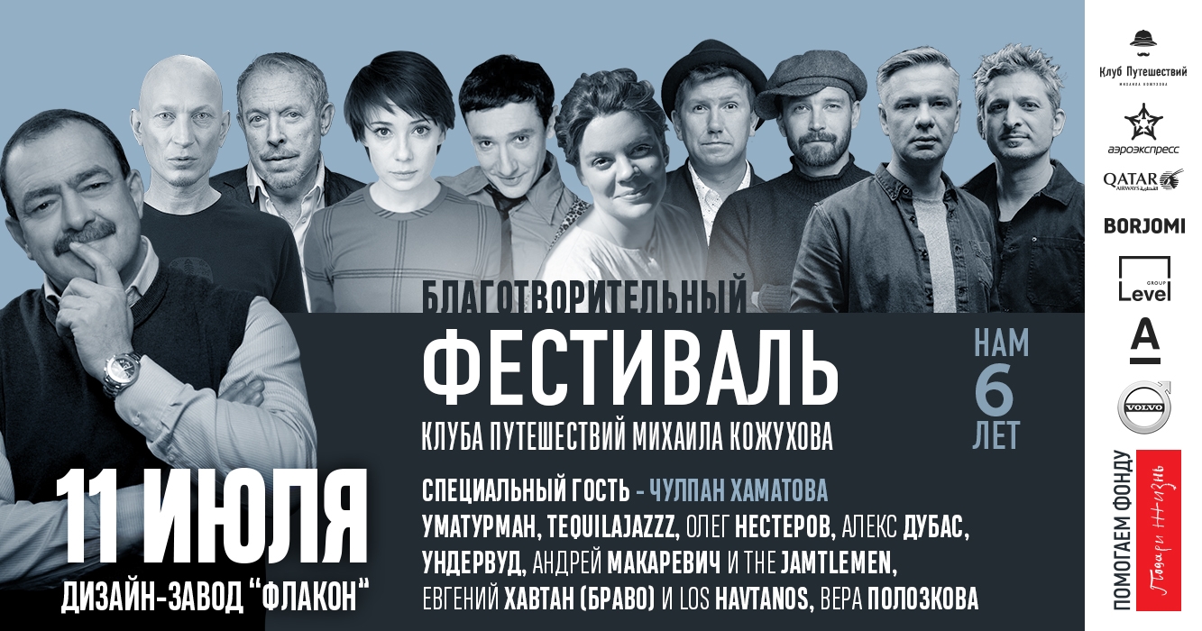 11 июля на дизайн-заводе «Флакон» пройдет первый благотворительный фестиваль Клуба путешествий Михаила Кожухова. Выступят Андрей Макаревич, группа «Ундервуд», Евгений Хавтан (группа «Браво») и группа «Tequilajazzz». Специальные гости вечера – радиоведущий и писатель Алекс Дубас, музыкант Олег Нестеров, писатель Наринэ Абгарян и Чулпан Хаматова – актриса и соучредитель фонда «Подари жизнь». Вся прибыль от продажи билетов будет передана благотворительному фонду «Подари жизнь» на лечение подопечных фонда.