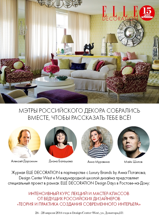 Журнал Elle Decoration в партнерстве с Design Center West, Международной Школой Дизайна и Luxury Brands by Анна Потапова представляет специальный проект Elle Decoration Design Days, который будет проходить в Ростове-на-Дону в апреле. Программа включает интенсивный курс лекций и мастер-классов от ведущих российских дизайнеров «Теория и практика создания современного интерьера».