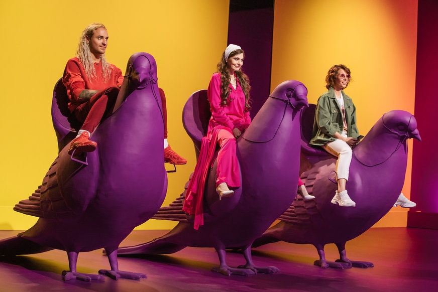 Для шоу «Бесплатный лук» были построены абсолютно уникальные декорации! В огромном павильоне на «Амедиа» была возведена невероятная студия, усыпанная гигантскими фиолетовыми и желтыми голубями. Все пространство выполнено в ярком и креативном цветовом решении, что, безусловно, является запоминающейся особенностью шоу. Члены жюри, сидящие на гигантские цветных голубях, ярко-желтый подиум, на котором появляются все наши герои – все эти детали придают особый шарм всему проекту.