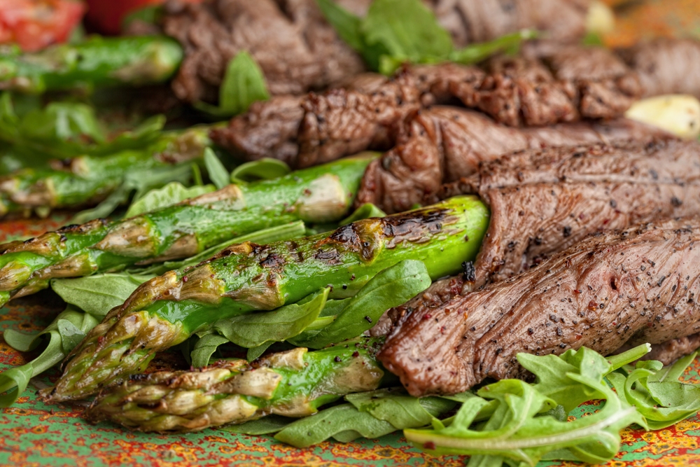 Тонко отбитая вырезка говядины со спаржей и листьями рукколы