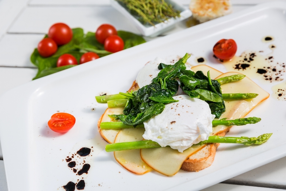 Обязательно попробуйте фирменный завтрак «Оливковый пляж» (390 руб.), куда входят тостовый хлеб, спаржа, яйцо пашот, копченый сыр, шпинат и помидоры черри.
