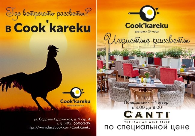 Кафе Cook`kareku приглашает встречать рассветы романтическими пузырьками: с понедельника по четверг, с 4.00 до 8.00 на все итальянские игристые вина от Canti действует специальная цена: