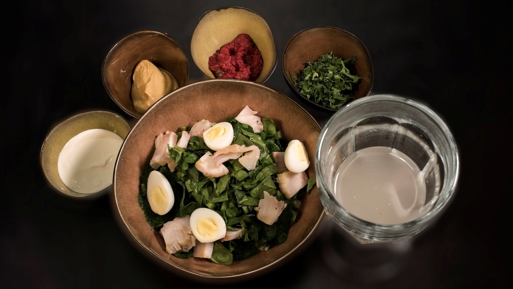 - Ботвинья на кислых щах, иначе называемых "белым квасом", c осетриной и протёртым шпинатом (450 р.)