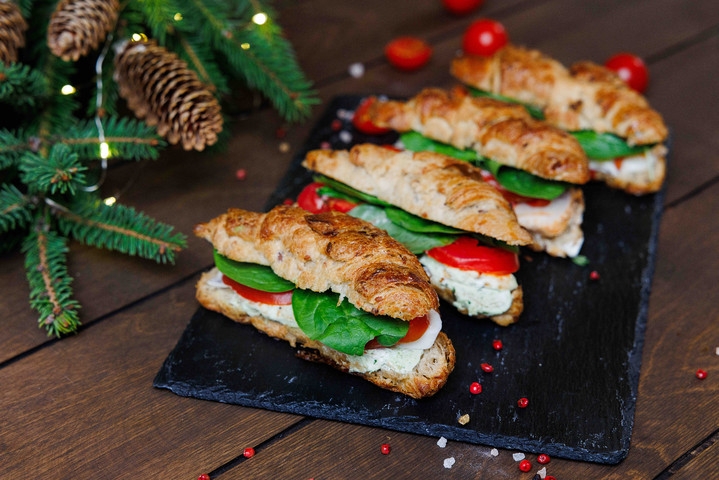 Закуски от шеф-повара: профитроли с лососем, сэндвич-сконы с неркой, авокадо и Песто, рулетики из баклажанов по грузинскому рецепту, и рулетики «четыре сыра» в лаваше. Сет из круассанов с цыплёнком и моцареллой - лёгкое начало праздника. Горячие блюда: томлёные говяжьи щёчки с картофелем и цветной капустой, запечённая утиная ножка с айвой и клюквой в ягодном соусе, филе утиной грудки с картофелем, спаржей и апельсиново-медовым соусом, стейк из свиной шейки с запечённым картофелем. Для любителей рыбы и морепродуктов - мидии под соусом васаби и стейк форели на подушке из шпината.