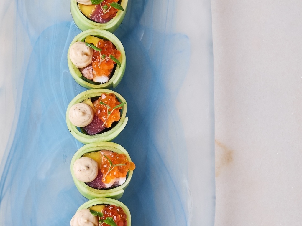Основные разделы меню наполнены уже проверенными хитами — тут и авторский дуэт из сахалинского гребешка с кровяной колбасой, и знаменитый краб-дог с черной икрой, и фаршированная фаланга камчатского краба с красной икрой. А большие лепёшки, в том числе с чилийским лососем и с тихоокеанскими креветками, выпекают прямо перед подачей в дровяной печи, расположенной в центре зала.