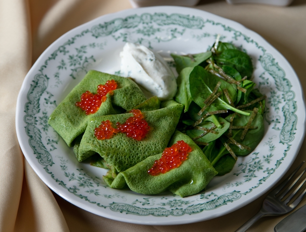 Блинный торт шеф-повар Павел Тарасов делает на основе зож-блинов из кабачков и шпината, а в качестве «крема» выступает риет из красных рыб. Декорируют блинный торт отборной красной икрой и при подаче дополняют сливочным шампань-соусом.
