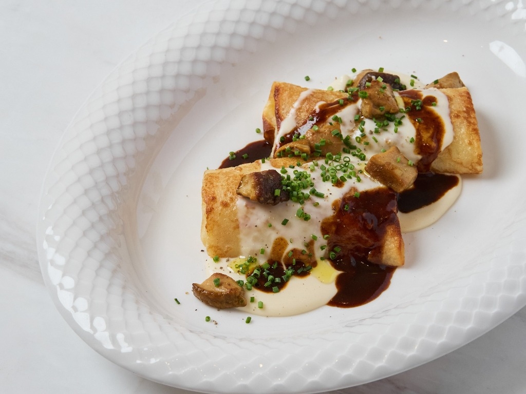 Блинный пирог в Atlantica готовят с начинкой из угря и трески, а за оттенки вкуса отвечает терияки и венчающий пирог опаленный угорь. Еще один вариант – с томленой говядиной и белыми грибами – посвятили поклонникам мясных блюд: эти блины подают с двумя видами соуса, демиглас и бешамель.