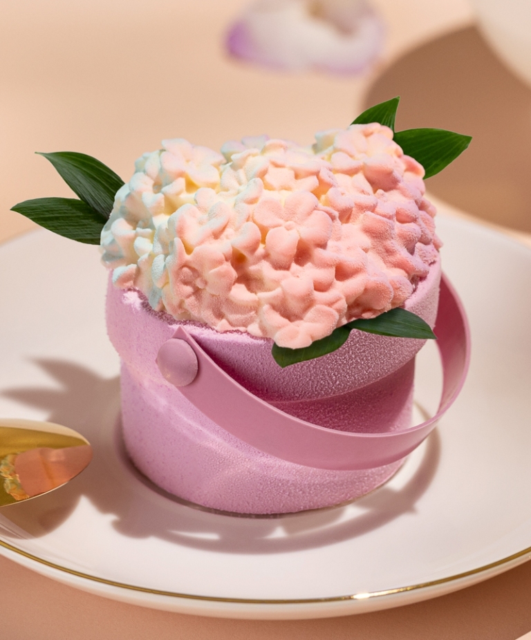 Десерт вдохновлён темой весны и объединяет ягодные, цитрусовые и цветочные акценты в многослойной композиции с лёгкой и воздушной текстурой. Визуал в виде гортензии подчёркивает праздничный характер подачи и делает десерт символичным подарком к 8 марта.